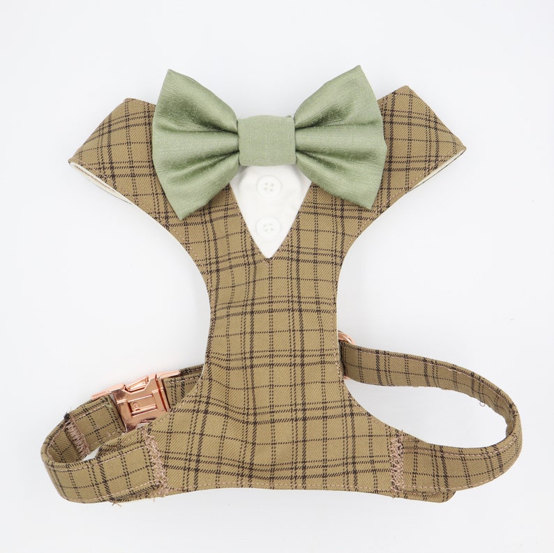 Tuxedo Wedding Dog Harness Beige Caramel Checked Suit with Sage Green Satin Bow CHOICE of COLOURS Made to Measure