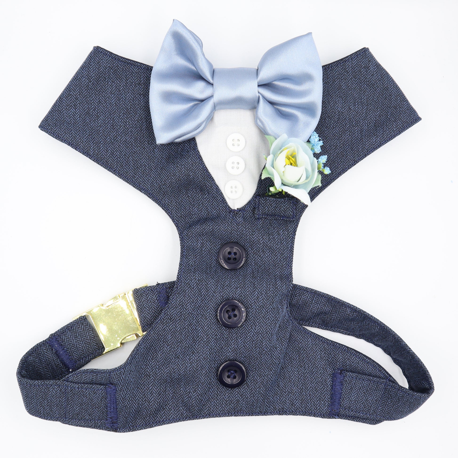 Tuxedo Wedding Dog Harness in Navy Blue Soft Herringbone Tweed Fabric with Dusty Blue Satin Bow CHOICE of COLOURS Made to Measure
