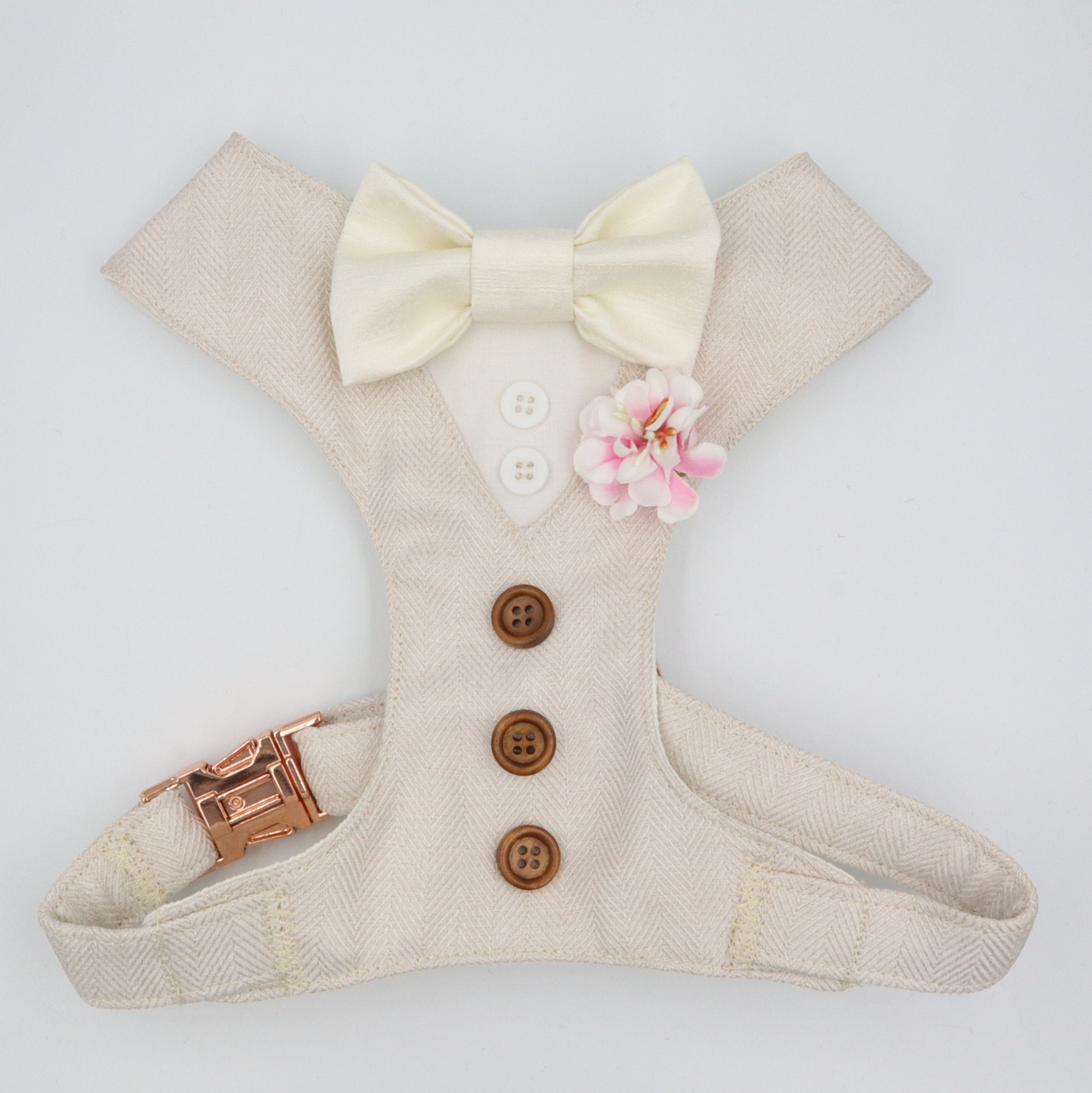 Tuxedo Wedding Dog Harness in Beige Soft Herringbone Tweed Fabric with Satin Bow CHOICE of COLOURS Made to Measure
